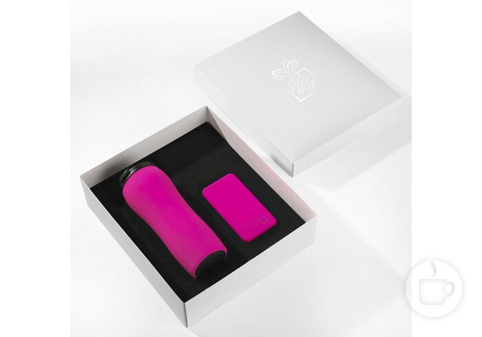 Rinkinys: gumuotas kelioninis puodelis 450ml + mobili išorinė baterija (Powerbank), talpa 4000mAh. Supakuota dovanų dėžutėje.