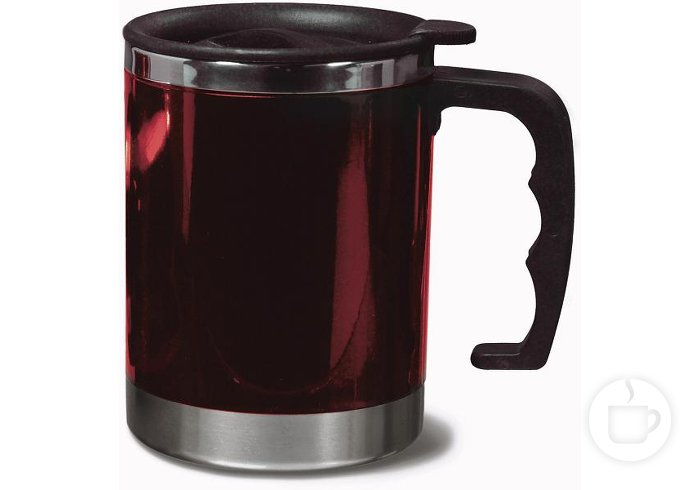 Plastikinis puodelis metaliniu vidumi, plastikiniu dangteliu ir rankenėle.