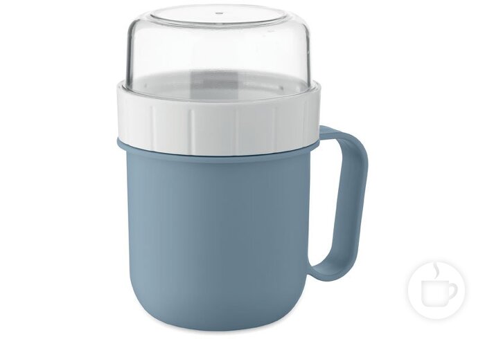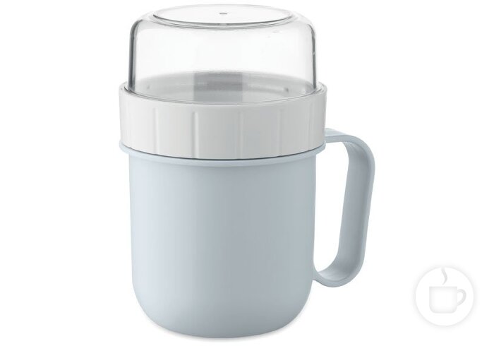 Pusryčių arba pietų puodelis iš PP plastikiko su PS plastiko skaidriu dangteliu. Susideda iš dviejų atskirų 450 ml ir 160 ml dalių, kad ingredientai būtų atskirti.